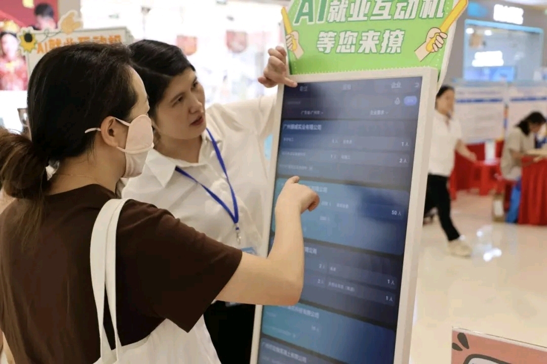 招聘会现场,数智就业一体机成为亮点。求职者输入个人信息和求职意向后,系统即可智能推荐适配岗位,提升人岗匹配效率。一体机还同步播放高清企业探访视频,直观展示企业文化、工作环境及岗位详情,让求职者提前“沉浸式”了解目标企业。
